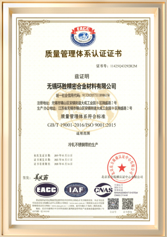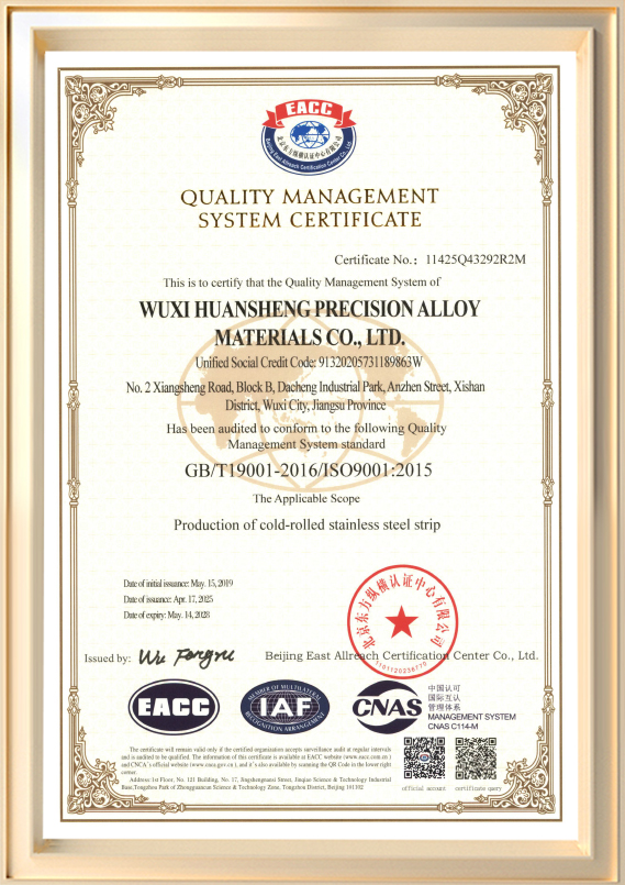 Spoločnosť Wuxi Huansheng Precision Alloy Materials Co., Ltd. (predtým Wuxi Huansheng Metal Products Co., Ltd.), založená v roku 2001, je špecializovaný výrobca zaoberajúci sa výskumom, vývojom a výrobou pásov z nehrdzavejúcej ocele valcovaných za studena. Spoločnosť má základné imanie 60 miliónov RMB a plochu závodu približne 45 990 metrov štvorcových s ročnou výrobnou kapacitou až 72 000 ton. Hrúbka produktu sa pohybuje od 0,03 mm do 3,0 mm, s maximálnou šírkou 550 mm.